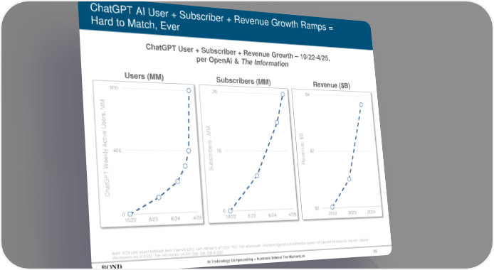 19 ChatGPT AI User + Subscriber + Revenue Growth Ramps = Hard to Match, Ever Note: 4/25 user count estimate from OpenAI CEO Sam Altman’s 4/11/25 TED Talk disclosure. Revenue figures are estimates based off OpenAI disclosures. Source: OpenAI disclosures (as of 4/25), The Information (4/25) (link, link, link & link) ChatGPT User + Subscriber + Revenue Growth – 10/22-4/25, per OpenAI & The Information AI Technology Compounding = Numbers Behind The Momentum ChatGPT Weekly Active Users, MM 0 400 800 10/22 8/23 6/24 4/25 Users (MM) 0 10 20 10/22 8/23 6/24 4/25 Subscribers (MM) Subscribers , MM Revenue ($B) Revenue, $B $0 $2 $4 2022 2023 2024