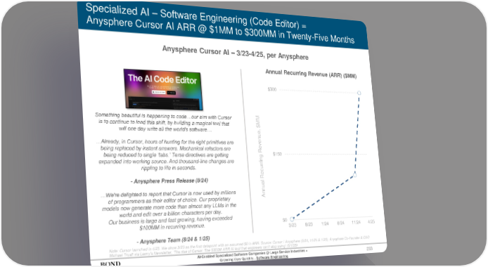 Specialized AI – Software Engineering (Code Editor) = Anysphere Cursor AI ARR @ $1MM to $300MM in Twenty-Five Months 233 Something beautiful is happening to code…our aim with Cursor is to continue to lead this shift, by building a magical tool that will one day write all the world's software… …Already, in Cursor, hours of hunting for the right primitives are being replaced by instant answers. Mechanical refactors are being reduced to single ‘tabs.’ Terse directives are getting expanded into working source. And thousand-line changes are rippling to life in seconds. - Anysphere Press Release (8/24) …We're delighted to report that Cursor is now used by millions of programmers as their editor of choice. Our proprietary models now generate more code than almost any LLMs in the world and edit over a billion characters per day. Our business is large and fast growing, having exceeded $100MM in recurring revenue. - Anysphere Team (8/24 & 1/25) Anysphere Cursor AI – 3/23-4/25, per Anysphere Annual Recurring Revenue (ARR) ($MM) Note: Cursor launched in 4/23. We show 3/23 as the first datapoint with an assumed $0 in ARR. Source: Cursor / Anysphere (8/24, 11/24 & 1/25), Anysphere Co-Founder & CEO Michael Truell via Lenny’s Newsletter, ‘The rise of Cursor: The $300M ARR AI tool that engineers can’t stop using’ (5/1/25) Annual Recurring Revenue, $MM AI-Enabled Specialized Software Companies @ Large Service Industries = Growing Very Quickly…Software Engineering $0 $150 $300 3/23 8/23 1/24 6/24 11/24 4/25