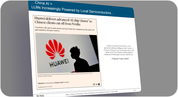 287 …China AI = LLMs Increasingly Powered by Local Semiconductors… Source: Financial Times, ‘Huawei delivers advanced AI chip ‘cluster’ to Chinese clients cut off from Nvidia’ (4/29/25) Huawei has started the delivery of its advanced artificial intelligence chip ‘cluster’ to Chinese clients who are increasing orders after being cut off from Nvidia’s semiconductors because of Washington’s export restrictions… - Financial Times, 4/29/25 USA vs. China in Technology = China’s AI Response Time Significantly Faster vs. Internet 1995