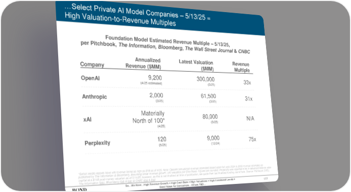 177 Foundation Model Estimated Revenue Multiple – 5/13/25, per Pitchbook, The Information, Bloomberg, The Wall Street Journal & CNBC …Select Private AI Model Companies – 5/13/25 = High Valuation-to-Revenue Multiples So…We Have…High Revenue Growth + High Cash Burn + High Valuations + High Investment Levels = Good News for Consumers…Others TBD… *Select media reports have xAI revenue being as high as $1B as of 4/25. Note: OpenAI annualized revenue estimated based upon full-year 2024 & 2025 revenue estimates as published by The Information & Bloomberg, assuming linear revenue growth. xAI valuation per Elon Musk. Figures are rounded. Perplexity was reported to be in advanced talks to raise capital at a $14B post-money valuation as of 5/14/25; however, as this is not finalized at time of publication, we quote their last finalized funding round here. Source: Pitchbook (5/25), The Information (link), Bloomberg (link & link) & CNBC (link & link) Annualized Revenue ($MM) Revenue Multiple 9,200 (4/25 estimated) 2,000 (3/25) 120 (5/25) 33x 31x 75x Latest Valuation ($MM) 300,000 (3/25) 61,500 (3/25) 80,000 (3/25) 9,000 (12/24) Company OpenAI Anthropic xAI Perplexity N/A Materially North of 100* (4/25)