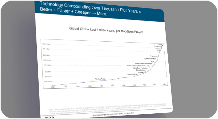 11 Technology Compounding Over Thousand-Plus Years = Better + Faster + Cheaper → More… Note: Chart expressed in trillions of real GDP as measured by 2011 ‘GK$’ on a logarithmic scale. GK$ (Gross Knowledge Dollars) is an informal term used to estimate the potential business value of a specific insight, idea, or proprietary knowledge. It reflects how much that knowledge could be worth if applied effectively, even if it hasn’t yet generated revenue. Source: Microsoft, ‘Governing AI: A Blueprint for the Future,’ Microsoft Report (5/23); Data via Maddison Project & Our World in Data Technology Compounding = Numbers Behind The Momentum Global GDP – Last 1,000+ Years, per Maddison Project 1100 1000 1300 1200 1400 1500 1600 1700 1800 1900 2000 Printing Press Steam Engines Telegraph Electrification Mass Steel Production Mass Production & Assembly Lines Internal Combustion Engine Flight Synthetic Fertilizer Transistors PCs Internet Smartphones Cloud