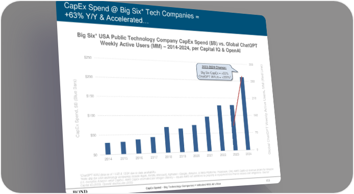 101 CapEx Spend @ Big Six* Tech Companies = +63% Y/Y & Accelerated… 1ChatGPT WAU data as of 11/23 & 12/24 due to data availability. *Note: Big Six USA technology companies include Apple, Nvidia, Microsoft, Alphabet / Google, Amazon, & Meta Platforms / Facebook. Only AWS CapEx & revenue shown for Amazon (i.e. excludes Amazon retail CapEx). AWS CapEx estimated per Morgan Stanley – equals AWS net additions to property & equipment less finance leases and obligations. Source: Capital IQ (3/25), OpenAI disclosures (3/25) Global ChatGPT Weekly Active Users, MM (Red Line) 0 70 140 210 280 350 $0 $50 $100 $150 $200 $250 2014 2015 2016 2017 2018 2019 2020 2021 2022 2023 2024 CapEx Spend, $B (Blue Bars) 2023-2024 Change: Big Six CapEx = +63% ChatGPT WAUs = +200%1 CapEx Spend – Big Technology Companies = Inflected With AI’s Rise Big Six* USA Public Technology Company CapEx Spend ($B) vs. Global ChatGPT Weekly Active Users (MM) – 2014-2024, per Capital IQ & OpenAI