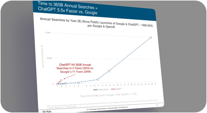 Time to 365B Annual Searches = ChatGPT 5.5x Faster vs. Google Note: Dashed-line bars are for years where Google did not disclose annual search volumes. Source: Google public disclosures, OpenAI (12/24). ChatGPT figures are estimates per company disclosures of ~1B daily queries Annual Searches by Year (B) Since Public Launches of Google & ChatGPT – 1998-2025, per Google & OpenAI 20 AI Technology Compounding = Numbers Behind The Momentum Annual Searches, B ChatGPT Hit 365B Annual Searches in 2 Years (2024) vs. Google’s 11 Years (2009) 0 2,500 5,000 1 2 3 4 5 6 7 8 9 10 11 12 13 14 15 16 17 18 19 20 21 22 23 24 25 26 27 Google Search ChatGPT Years Since Public Launch (Google = 9/98, ChatGPT = 11/22)