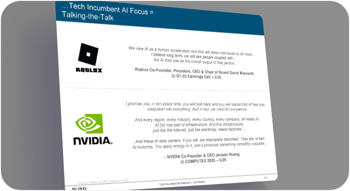 66 …Tech Incumbent AI Focus = Talking-the-Talk Source: Roblox (5/1/25), NVIDIA (5/18/25) We view AI as a human acceleration tool that will allow individuals to do more... I believe long term, we will see people coupled with… the AI they use as the overall output of that person. - Roblox Co-Founder, President, CEO & Chair of Board David Baszucki @ Q1:25 Earnings Call – 5/25 Tech Incumbent AI Adoption = Top Priority I promise you, in ten years' time, you will look back and you will realize that AI has now integrated into everything. And in fact, we need AI everywhere. And every region, every industry, every country, every company, all needs AI. AI [is] now part of infrastructure. And this infrastructure, just like the internet, just like electricity, needs factories…. …And these AI data centers, if you will, are improperly described. They are, in fact, AI factories. You apply energy to it, and it produces something incredibly valuable. - NVIDIA Co-Founder & CEO Jensen Huang @ COMPUTEX 2025 – 5/25