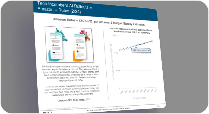 Tech Incumbent AI Rollouts = Amazon – Rufus (2/24) Source: Amazon; Morgan Stanley estimates Amazon: Rufus – 12/22-3/25, per Amazon & Morgan Stanley Estimates We have so many customers now who just use Rufus to help them find a quick fact about a product. They also use Rufus to figure out how to summarize customer reviews, so they don't have to read 100 customer reviews to get a sense of what people think about that product…the personalization keeps getting much better… …And so, we expect throughout 2025, that the number of occasions where you're not sure what you want to buy and you want help from Rufus are going to continue to increase and be more and more helpful to customers. - Amazon CEO Andy Jassy, 2/25 Last Twelve Months Retail GMV, $B Amazon North America Retail Estimated Gross Merchandise Value ($B), Last 12 Months Quarter Ending 2/24: Rufus announced 206 AI – Tech Incumbents = Broad & Steady Product / Feature Rollouts $0 $200 $400 $600