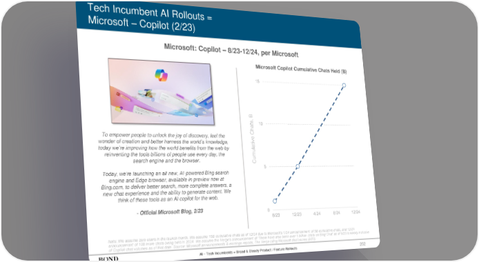 Tech Incumbent AI Rollouts = Microsoft – Copilot (2/23) Note: We assume zero users in the launch month. We assume 15B cumulative chats as of 12/24 due to Microsoft’s 1/24 announcement of 5B cumulative chats, and 12/24 announcement of 10B more chats being held in 2024. We assume the Verge’s announcement of ‘There have also been over 1 billion chats on Bing Chat’ as of 8/23 is wholly inclusive of Copilot chat volumes as of that date. Source: Microsoft announcements & earnings reports, The Verge citing Microsoft disclosures (8/23) Microsoft: Copilot – 8/23-12/24, per Microsoft To empower people to unlock the joy of discovery, feel the wonder of creation and better harness the world’s knowledge, today we’re improving how the world benefits from the web by reinventing the tools billions of people use every day, the search engine and the browser. Today, we’re launching an all new, AI-powered Bing search engine and Edge browser, available in preview now at Bing.com, to deliver better search, more complete answers, a new chat experience and the ability to generate content. We think of these tools as an AI copilot for the web. - Official Microsoft Blog, 2/23 Cumulative Chats, B 202 AI – Tech Incumbents = Broad & Steady Product / Feature Rollouts 0 5 10 15 8/23 12/23 4/24 8/24 12/24 Microsoft Copilot Cumulative Chats Held (B)