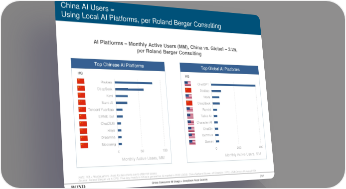 Top Global AI Platforms 297 China AI Users = Using Local AI Platforms, per Roland Berger Consulting Note: HQ = Headquarters. Axes for two charts are to different scales. Source: Roland Berger via AICPB, ‘Five key trends in China's generative AI market in 2025’ (3/25); China National Bureau of Statistics (1/25); USA Census Bureau (4/25) HQ HQ China Consumer AI Usage = DeepSeek Rose Quickly 0 50 100 Mooxiang Dreamina xinye ChatGLM ERNIE Bot Tencent Yuanbao Nami AI Kimi DeepSeek Doubao Top Chinese AI Platforms 0 200 400 Gemini Gemnius ChatOn Character AI Talkie AI Remini DeepSeek Nova Doubao ChatGPT Monthly Active Users, MM Monthly Active Users, MM AI Platforms – Monthly Active Users (MM), China vs. Global – 3/25, per Roland Berger Consulting