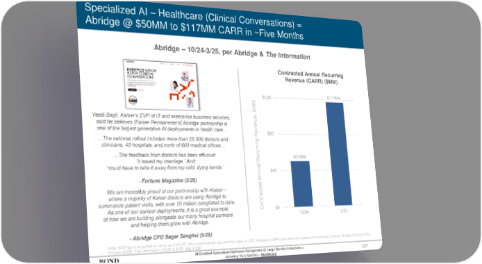 Specialized AI – Healthcare (Clinical Conversations) = Abridge @ $50MM to $117MM CARR in ~Five Months 237 Yazdi Bagli, Kaiser’s EVP of IT and enterprise business services, said he believes [Kaiser Permanente’s] Abridge partnership is one of the largest generative AI deployments in health care… …The national rollout includes more than 25,000 doctors and clinicians, 40 hospitals, and north of 600 medical offices… …The feedback from doctors has been effusive: ‘It saved my marriage.’ And: ‘You’d have to take it away from my cold, dying hands.’ - Fortune Magazine (2/25) Contracted Annual Recurring Revenue (CARR) ($MM) Note: 3/25 figure is quoted as being as of Q1:25. We conservatively assume this maps to 3/25. Abridge’s CARR goes live within weeks of contracting. Source: Abridge (12/24 & 5/25), Fortune (2/25), The Information (10/24 & 5/25) (link & link) Abridge – 10/24-3/25, per Abridge & The Information Contracted Annual Recurring Revenue, $MM AI-Enabled Specialized Software Companies @ Large Service Industries = Growing Very Quickly…Healthcare We are incredibly proud of our partnership with Kaiser – where a majority of Kaiser doctors are using Abridge to summarize patient visits, with over 10 million completed to date. As one of our earliest deployments, it is a great example of how we are building alongside our many hospital partners and helping them grow with Abridge. - Abridge CFO Sagar Sanghvi (5/25) $50MM $117MM $0 $40 $80 $120 10/24 3/25