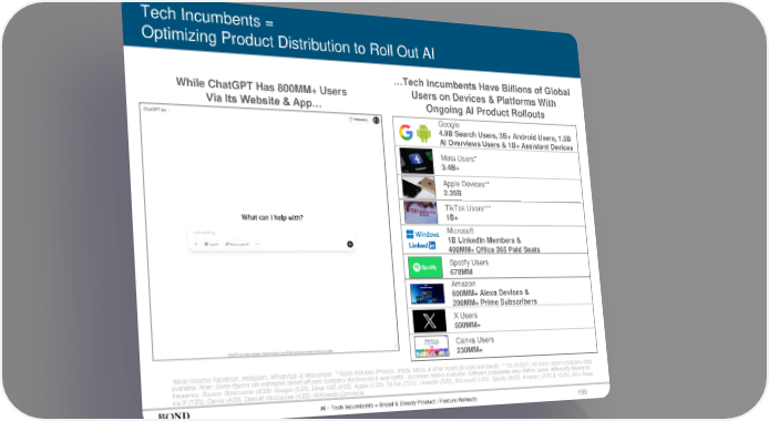 199 Tech Incumbents = Optimizing Product Distribution to Roll Out AI *Meta includes Facebook, Instagram, WhatsApp, & Messenger. **Apple includes iPhones, iPads, Macs, & other Apple devices worldwide. ***As of 2021; no more recent company data available. Note: Some figures are estimates based off past company disclosures & web traffic / purchase history analytics. Different companies may define ‘users’ differently based on frequency. Source: Statcounter (2/25), Google (5/25), Meta 10Q (4/25), Apple (1/25), TikTok (7/21), LinkedIn (5/25), Microsoft (1/24), Spotify (5/25), Amazon (2/25 & 10/24), Elon Musk via X (7/23), Canva (4/25), OpenAI disclosures (4/25), Wikimedia Commons While ChatGPT Has 800MM+ Users Via Its Website & App… …Tech Incumbents Have Billions of Global Users on Devices & Platforms With Ongoing AI Product Rollouts Meta Users* 3.4B+ Apple Devices** 2.35B Google 4.9B Search Users, 3B+ Android Users, 1.5B AI Overviews Users & 1B+ Assistant Devices TikTok Users*** 1B+ Amazon 600MM+ Alexa Devices & 200MM+ Prime Subscribers X Users 500MM+ Canva Users 230MM+ AI – Tech Incumbents = Broad & Steady Product / Feature Rollouts Spotify Users 678MM Microsoft 1B LinkedIn Members & 400MM+ Office 365 Paid Seats