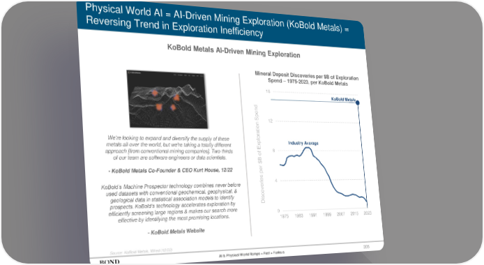 305 Physical World AI = AI-Driven Mining Exploration (KoBold Metals) = Reversing Trend in Exploration Inefficiency KoBold Metals AI-Driven Mining Exploration Source: KoBold Metals, Wired (12/22) Mineral Deposit Discoveries per $B of Exploration Spend – 1975-2023, per KoBold Metals We're looking to expand and diversify the supply of these metals all over the world, but we're taking a totally different approach [from conventional mining companies]. Two-thirds of our team are software engineers or data scientists. - KoBold Metals Co-Founder & CEO Kurt House, 12/22 KoBold’s Machine Prospector technology combines never before used datasets with conventional geochemical, geophysical, & geological data in statistical association models to identify prospects. KoBold’s technology accelerates exploration by efficiently screening large regions & makes our search more effective by identifying the most promising locations. - KoBold Metals Website Discoveries per $B of Exploration Spend 0 4 8 12 16 1975 1983 1991 1999 2007 2015 2023 AI & Physical World Ramps = Fast + Furious KoBold Metals Industry Average