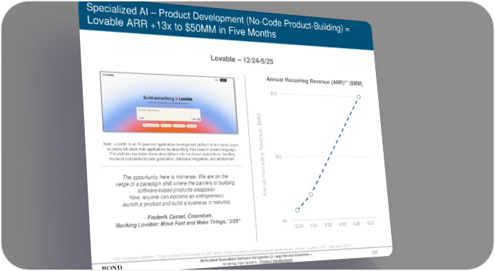 235 Specialized AI – Product Development (No-Code Product-Building) = Lovable ARR +13x to $50MM in Five Months The opportunity here is immense. We are on the verge of a paradigm shift where the barriers to building software-based products disappear. Now, anyone can become an entrepreneur, launch a product and build a business in minutes. - Frederik Cassel, Creandum, ‘Backing Lovable: Move Fast and Make Things,’ 2/25* Annual Recurring Revenue, $MM *Per Creandum website. **From Lovable Co-Founder & CEO Anton Osika’s LinkedIn posts & podcast appearances. Source: Lovable (5/25), Creandum (2/25) Note: Lovable is an AI-powered application development platform that enables users to create full-stack web applications by describing their ideas in natural language. The platform translates these descriptions into functional applications, handling frontend and backend code generation, database integration, and deployment. Lovable – 12/24-5/25 Annual Recurring Revenue (ARR)** ($MM) $0 $25 $50 12/24 1/25 2/25 3/25 4/25 5/25 AI-Enabled Specialized Software Companies @ Large Service Industries = Growing Very Quickly…Product Development