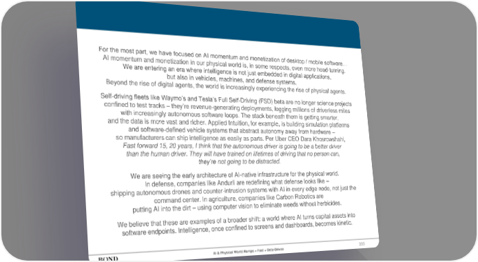300 For the most part, we have focused on AI momentum and monetization of desktop / mobile software… AI momentum and monetization in our physical world is, in some respects, even more head-turning. We are entering an era where intelligence is not just embedded in digital applications, but also in vehicles, machines, and defense systems. Beyond the rise of digital agents, the world is increasingly experiencing the rise of physical agents. Self-driving fleets like Waymo’s and Tesla’s Full Self-Driving (FSD) beta are no longer science projects confined to test tracks – they’re revenue-generating deployments, logging millions of driverless miles with increasingly autonomous software loops. The stack beneath them is getting smarter, and the data is more vast and richer. Applied Intuition, for example, is building simulation platforms and software-defined vehicle systems that abstract autonomy away from hardware – so manufacturers can ship intelligence as easily as parts. Per Uber CEO Dara Khosrowshahi, Fast forward 15, 20 years, I think that the autonomous driver is going to be a better driver than the human driver. They will have trained on lifetimes of driving that no person can, they’re not going to be distracted. We are seeing the early architecture of AI-native infrastructure for the physical world. In defense, companies like Anduril are redefining what defense looks like – shipping autonomous drones and counter-intrusion systems with AI in every edge node, not just the command center. In agriculture, companies like Carbon Robotics are putting AI into the dirt – using computer vision to eliminate weeds without herbicides. We believe that these are examples of a broader shift: a world where AI turns capital assets into software endpoints. Intelligence, once confined to screens and dashboards, becomes kinetic. AI & Physical World Ramps = Fast + Data-Driven