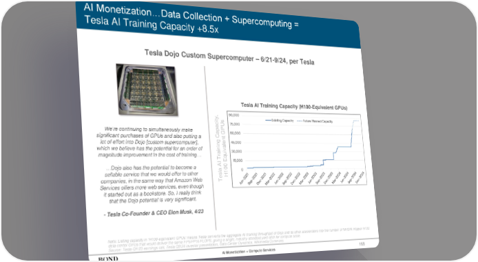 168 AI Monetization…Data Collection + Supercomputing = Tesla AI Training Capacity +8.5x Tesla Dojo Custom Supercomputer – 6/21-9/24, per Tesla Note: Listing capacity in ‘H100-equivalent GPUs’ means Tesla converts the aggregate AI-training throughput of Dojo and its other accelerators into the number of NVIDIA Hopper H100 data-center GPUs that would deliver the same FP8/FP16 FLOPS, giving a single, industry-standard yard-stick for compute scale. Source: Tesla Q1:23 earnings call, Tesla Q3:24 investor presentation, Data Center Dynamics, Wikimedia Commons Tesla AI Training Capacity, H100 Equivalent GPUs We’re continuing to simultaneously make significant purchases of GPUs and also putting a lot of effort into Dojo [custom supercomputer], which we believe has the potential for an order of magnitude improvement in the cost of training… …Dojo also has the potential to become a sellable service that we would offer to other companies, in the same way that Amazon Web Services offers more web services, even though it started out as a bookstore. So, I really think that the Dojo potential is very significant. - Tesla Co-Founder & CEO Elon Musk, 4/23 AI Monetization = Compute Services Tesla AI Training Capacity (H100-Equivalent GPUs)
