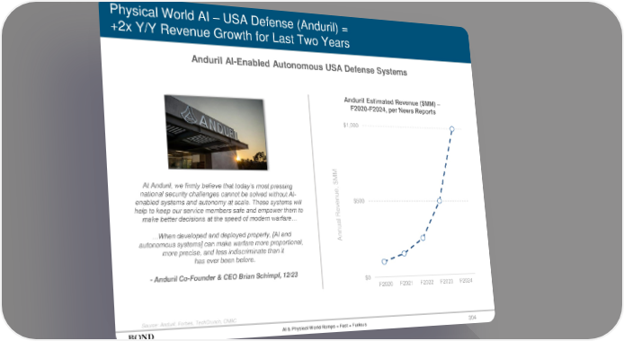 304 Physical World AI – USA Defense (Anduril) = +2x Y/Y Revenue Growth for Last Two Years Anduril AI-Enabled Autonomous USA Defense Systems Source: Anduril, Forbes, TechCrunch, CNBC Annual Revenue, $MM Anduril Estimated Revenue ($MM) – F2020-F2024, per News Reports $0 $500 $1,000 F2020 F2021 F2022 F2023 F2024 At Anduril, we firmly believe that today’s most pressing national security challenges cannot be solved without AI- enabled systems and autonomy at scale. These systems will help to keep our service members safe and empower them to make better decisions at the speed of modern warfare… …When developed and deployed properly, [AI and autonomous systems] can make warfare more proportional, more precise, and less indiscriminate than it has ever been before. - Anduril Co-Founder & CEO Brian Schimpf, 12/23 AI & Physical World Ramps = Fast + Furious
