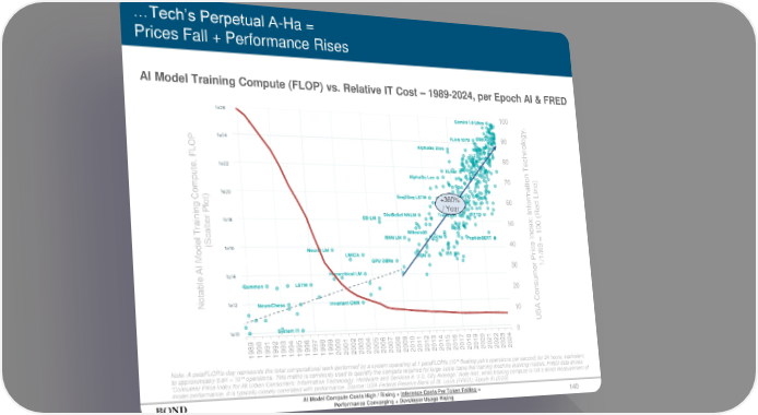 1989 1990 1991 1992 1993 1994 1995 1996 1997 1998 1999 2000 2001 2002 2003 2004 2005 2006 2007 2008 2009 2010 2011 2012 2013 2014 2015 2016 2017 2018 2019 2020 2021 2022 2023 2024 0 10 20 30 40 50 60 70 80 90 100 140 …Tech’s Perpetual A-Ha = Prices Fall + Performance Rises Note: A petaFLOP/s-day represents the total computational work performed by a system operating at 1 petaFLOP/s (10¹⁵ floating-point operations per second) for 24 hours, equivalent to approximately 8.64 × 10¹⁹ operations. This metric is commonly used to quantify the compute required for large-scale tasks like training machine learning models. FRED data shows ‘Consumer Price Index for All Urban Consumers: Information Technology, Hardware and Services in U.S. City Average.’ Note that, while training compute is not a direct measurement of model performance, it is typically closely correlated with performance. Source: USA Federal Reserve Bank of St. Louis (FRED); Epoch AI (5/25) Notable AI Model Training Compute, FLOP (Scatter Plot) USA Consumer Price Index: Information Technology, 1/1/89 = 100 (Red Line) +360% / Year AI Model Compute Costs High / Rising + Inference Costs Per Token Falling = Performance Converging + Developer Usage Rising AI Model Training Compute (FLOP) vs. Relative IT Cost – 1989-2024, per Epoch AI & FRED