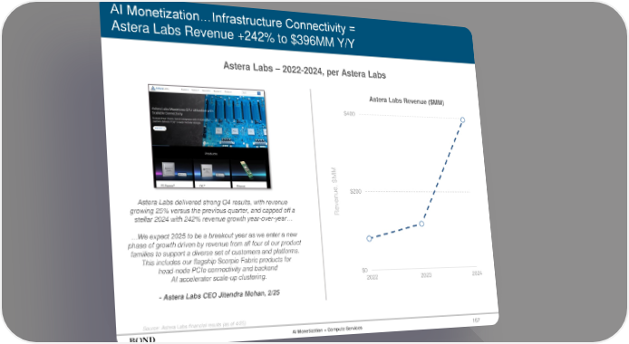 167 AI Monetization…Infrastructure Connectivity = Astera Labs Revenue +242% to $396MM Y/Y Astera Labs – 2022-2024, per Astera Labs Source: Astera Labs financial results (as of 4/25) Astera Labs delivered strong Q4 results, with revenue growing 25% versus the previous quarter, and capped off a stellar 2024 with 242% revenue growth year-over-year… …We expect 2025 to be a breakout year as we enter a new phase of growth driven by revenue from all four of our product families to support a diverse set of customers and platforms. This includes our flagship Scorpio Fabric products for head-node PCIe connectivity and backend AI accelerator scale-up clustering. - Astera Labs CEO Jitendra Mohan, 2/25 Revenue, $MM AI Monetization = Compute Services $0 $200 $400 2022 2023 2024 Astera Labs Revenue ($MM)