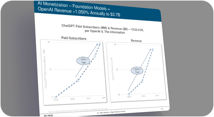 192 AI Monetization – Foundation Models = OpenAI Revenue +1,050% Annually to $3.7B Source: OpenAI disclosures (as of 4/25), The Information (4/25) (link, link, link & link) AI – New Entrants = Rapid Revenue Growth 0 10 20 10/22 8/23 6/24 4/25 ChatGPT Paid Subscribers , MM +153% / Year Paid Subscribers $0 $2 $4 2022 2023 2024 OpenAI Revenue, $B 1,050% / Year Revenue ChatGPT Paid Subscribers (MM) & Revenue ($B) – 10/22-4/25, per OpenAI & The Information