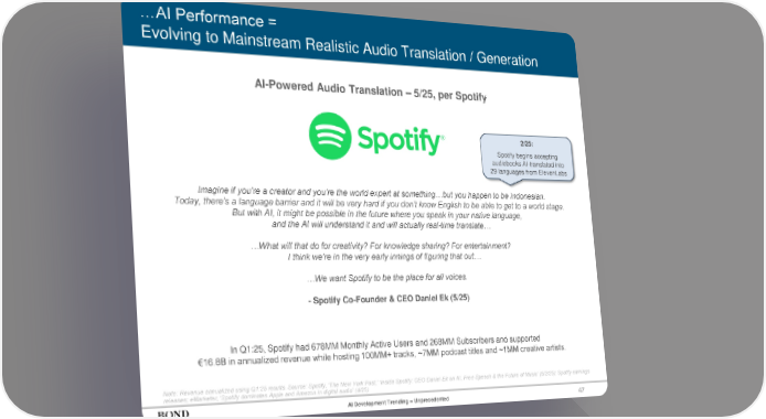 47 …AI Performance = Evolving to Mainstream Realistic Audio Translation / Generation Note: Revenue annualized using Q1:25 results. Source: Spotify, ‘The New York Post,’ ‘Inside Spotify: CEO Daniel Ek on AI, Free Speech & the Future of Music’ (5/2/25); Spotify earnings releases; eMarketer, ‘Spotify dominates Apple and Amazon in digital audio’ (4/25) AI-Powered Audio Translation – 5/25, per Spotify Imagine if you’re a creator and you’re the world expert at something…but you happen to be Indonesian. Today, there’s a language barrier and it will be very hard if you don’t know English to be able to get to a world stage. But with AI, it might be possible in the future where you speak in your native language, and the AI will understand it and will actually real-time translate… …What will that do for creativity? For knowledge sharing? For entertainment? I think we’re in the very early innings of figuring that out… …We want Spotify to be the place for all voices. - Spotify Co-Founder & CEO Daniel Ek (5/25) In Q1:25, Spotify had 678MM Monthly Active Users and 268MM Subscribers and supported €16.8B in annualized revenue while hosting 100MM+ tracks, ~7MM podcast titles and ~1MM creative artists. AI Development Trending = Unprecedented 2/25: Spotify begins accepting audiobooks AI-translated into 29 languages from ElevenLabs