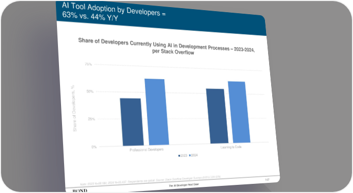 147 AI Tool Adoption by Developers = 63% vs. 44% Y/Y Share of Developers Currently Using AI in Development Processes – 2023-2024, per Stack Overflow Note: 2023 N=89,184; 2024 N=65,437. Respondents are global. Source: Stack Overflow Developer Surveys (5/23 & 5/24-6/24) Share of Developers, % 0% 25% 50% 75% Professional Developers Learning to Code 2023 2024 The AI Developer Next Door