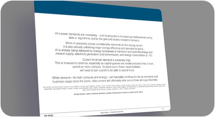 126 Data Centers = Electricity Guzzlers …AI’s power demands are increasing – and its progress is increasingly bottlenecked not by data or algorithms, but by the grid and strains related to demand. While AI presently places considerable demands on the energy sector, it is also already unlocking major energy efficiency and operational gains… AI is already being deployed by energy companies to transform and optimize energy and mineral supply, electricity generation and transmission, and energy consumption (p. 16). Current AI-driven demand is extremely high. This is forecast to continue, especially as capital gushes into model providers that, in turn, spend on more compute. At some point, these model builders will need to turn a profit to be able to spend more. While demand – for both compute and energy – will inevitably continue to rise as consumer and business usage does the same, data centers will ultimately only serve those who pay their bills. *IEA member countries include Australia, Austria, Belgium, Canada, Czech Republic, Denmark, Estonia, Finland, France, Germany, Greece, Hungary, Ireland, Italy, Japan, S. Korea, Latvia, Lithuania, Luxembourg, Mexico, Netherlands, New Zealand, Norway, Poland, Portugal, Slovak Republic, Spain, Sweden, Switzerland, Republic of Türkiye, United Kingdom, and United States. IEA Association countries include Argentina, Brazil, China, Egypt, India, Indonesia, Kenya, Morocco, Senegal, Singapore, S. Africa, Thailand, and Ukraine. All data shown, unless otherwise specified, is global. Italicized text is directly quoted from the report.