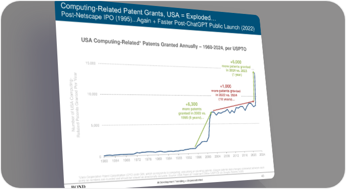 40 Computing-Related Patent Grants, USA = Exploded… Post-Netscape IPO (1995)...Again + Faster Post-ChatGPT Public Launch (2022) USA Computing-Related* Patents Granted Annually – 1960-2024, per USPTO *Uses Cooperative Patent Classification (CPC) code G06, which corresponds to computing, calculating or counting patents. Google patents data changes somewhat between each query so numbers are rounded and should be viewed as directionally accurate. Source: USA Patent & Trademark Office (USPTO) via Google Patents (4/25) 0 5,000 10,000 15,000 1960 1964 1968 1972 1976 1980 1984 1988 1992 1996 2000 2004 2008 2012 2016 2020 2024 Number of USA Computing- Related Patents Granted Per Year +6,300 more patents granted in 2003 vs. 1995 (8 years)… +1,000 more patents granted in 2022 vs. 2004 (18 years)… +6,000 more patents granted in 2024 vs. 2023 (1 year) AI Development Trending = Unprecedented