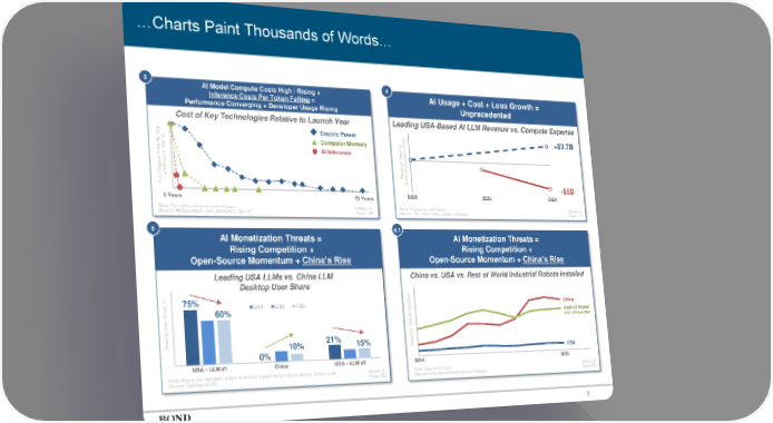 5 …Charts Paint Thousands of Words… AI Monetization Threats = Rising Competition + Open-Source Momentum + China’s Rise 5 Leading USA LLMs vs. China LLM Desktop User Share Note: Data is non-deduped. Share is relative, measured across six leading global LLMs. Source: YipitData (5/25) Desktop User Share, % 2/24 2/25 4/25 75% 60% 10% 21% 15% 0% Details on Page 293 USA – LLM #1 China USA – LLM #2 AI Model Compute Costs High / Rising + Inference Costs Per Token Falling = Performance Converging + Developer Usage Rising 3 Cost of Key Technologies Relative to Launch Year % of Original Price By Year (Indexed to Year 0) Note: Per-token inference costs shown. Source: Richard Hirsh; John McCallum; OpenAI Details on Page 138 0 Years 72 Years Electric Power Computer Memory AI Inference AI Monetization Threats = Rising Competition + Open-Source Momentum + China’s Rise 5.1 China vs. USA vs. Rest of World Industrial Robots Installed Note: Data as of 2023. Source: International Federation of Robotics Industrial Robots Installed Details on Page 289 AI Usage + Cost + Loss Growth = Unprecedented 4 Leading USA-Based AI LLM Revenue vs. Compute Expense Note: Figures are estimates. Source: The Information, public estimates 2022 2024 Revenue (Blue) & Compute Expense (Red) +$3.7B -$5B Details on Page 173 2023 China Rest of World (excl. China & USA) USA 2014 2023