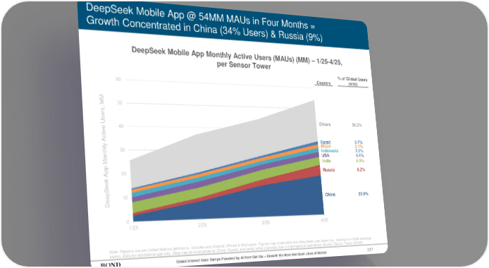317 DeepSeek Mobile App @ 54MM MAUs in Four Months = Growth Concentrated in China (34% Users) & Russia (9%) Global Internet User Ramps Powered by AI from Get-Go = Growth We Have Not Seen Likes of Before 0 10 20 30 40 50 60 1/25 2/25 3/25 4/25 China Egypt Brazil Indonesia USA India Russia Note: Regions are per United Nations definitions. Includes only Android, iPhone & iPad users. Figures may understate true DeepSeek user base (e.g., desktop or mobile webpage users). Data for standalone app only. Data may be incomplete for China, Russia, and select other countries due to informational restrictions. Source: Sensor Tower (5/6/25) Country % of Global Users (4/25) 33.9% 2.7% 3.1% 3.5% 4.4% 6.9% 9.2% DeepSeek Mobile App Monthly Active Users (MAUs) (MM) – 1/25-4/25, per Sensor Tower DeepSeek App Monthly Active Users, MM Others 36.2%