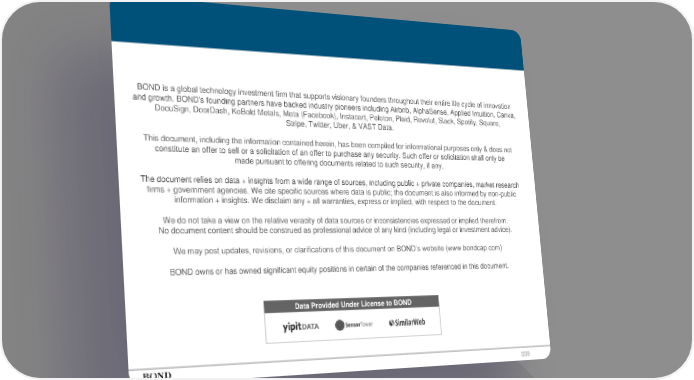 339 BOND is a global technology investment firm that supports visionary founders throughout their entire life cycle of innovation and growth. BOND's founding partners have backed industry pioneers including Airbnb, AlphaSense, Applied Intuition, Canva, DocuSign, DoorDash, KoBold Metals, Meta (Facebook), Instacart, Peloton, Plaid, Revolut, Slack, Spotify, Square, Stripe, Twitter, Uber, & VAST Data. This document, including the information contained herein, has been compiled for informational purposes only & does not constitute an offer to sell or a solicitation of an offer to purchase any security. Such offer or solicitation shall only be made pursuant to offering documents related to such security, if any. The document relies on data + insights from a wide range of sources, including public + private companies, market research firms + government agencies. We cite specific sources where data is public; the document is also informed by non-public information + insights. We disclaim any + all warranties, express or implied, with respect to the document. We do not take a view on the relative veracity of data sources or inconsistencies expressed or implied therefrom. No document content should be construed as professional advice of any kind (including legal or investment advice). We may post updates, revisions, or clarifications of this document on BOND’s website (www.bondcap.com). BOND owns or has owned significant equity positions in certain of the companies referenced in this document. Data Provided Under License to BOND