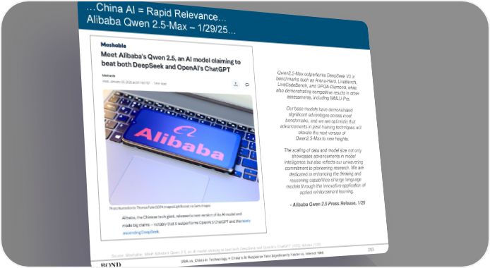 283 …China AI = Rapid Relevance… Alibaba Qwen 2.5-Max – 1/29/25… Source: Mashable, ‘Meet Alibaba’s Qwen 2.5, an AI model claiming to beat both DeepSeek and OpenAI’s ChatGPT’ (1/25); Alibaba (1/25) Qwen2.5-Max outperforms DeepSeek V3 in benchmarks such as Arena-Hard, LiveBench, LiveCodeBench, and GPQA-Diamond, while also demonstrating competitive results in other assessments, including MMLU-Pro. Our base models have demonstrated significant advantages across most benchmarks, and we are optimistic that advancements in post-training techniques will elevate the next version of Qwen2.5-Max to new heights. The scaling of data and model size not only showcases advancements in model intelligence but also reflects our unwavering commitment to pioneering research. We are dedicated to enhancing the thinking and reasoning capabilities of large language models through the innovative application of scaled reinforcement learning. - Alibaba Qwen 2.5 Press Release, 1/25 USA vs. China in Technology = China’s AI Response Time Significantly Faster vs. Internet 1995