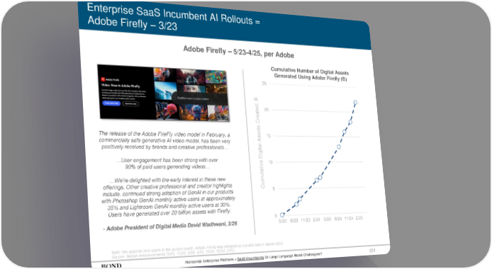 221 Enterprise SaaS Incumbent AI Rollouts = Adobe Firefly – 3/23 Note: We assume zero users in the launch month. Adobe Firefly was released as a public beta in March 2023. Source: Adobe announcements (9/23, 10/23, 3/24, 4/24, 10/24, 12/24, 2/25) Adobe Firefly – 5/23-4/25, per Adobe The release of the Adobe FireFly video model in February, a commercially safe generative AI video model, has been very positively received by brands and creative professionals… …User engagement has been strong with over 90% of paid users generating videos… …We're delighted with the early interest in these new offerings. Other creative professional and creator highlights include, continued strong adoption of GenAI in our products with Photoshop GenAI monthly active users at approximately 35% and Lightroom GenAI monthly active users at 30%. Users have generated over 20 billion assets with Firefly. - Adobe President of Digital Media David Wadhwani, 3/25 Cumulative Digital Assets Created, B Cumulative Number of Digital Assets Generated Using Adobe Firefly (B) 0 5 10 15 20 25 5/23 8/23 11/23 2/24 5/24 8/24 11/24 2/25 Horizontal Enterprise Platform = SaaS Incumbents Or Large Language Model Challengers?