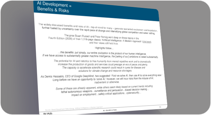 50 AI Development = Benefits & Risks The widely-discussed benefits and risks of AI – top-of-mind for many – generate warranted excitement and trepidation, further fueled by uncertainty over the rapid pace of change and intensifying global competition and saber rattling. The pros Stuart Russell and Peter Norvig went deep on these topics in the Fourth Edition (2020) of their 1,116-page classic ‘Artificial Intelligence: A Modern Approach’ (link here), and their views still hold true. Highlights follow… …the benefits: put simply, our entire civilization is the product of our human intelligence. If we have access to substantially greater machine intelligence, the [ceiling of our] ambitions is raised substantially. The potential for AI and robotics to free humanity from menial repetitive work and to dramatically increase the production of goods and services could presage an era of peace and plenty. The capacity to accelerate scientific research could result in cures for disease and solutions for climate change and resource shortages. As Demis Hassabis, CEO of Google DeepMind, has suggested: ‘First we solve AI, then use AI to solve everything else.’ Long before we have an opportunity to ‘solve AI,’ however, we will incur risks from the misuse of AI, inadvertent or otherwise. Some of these are already apparent, while others seem likely based on current trends including lethal autonomous weapons…surveillance and persuasion…biased decision making… impact on employment…safety-critical applications…cybersecurity… AI = Benefits & Risks Source: Stuart Russell and Peter Norvig, ‘Artificial Intelligence: A Modern Approach’