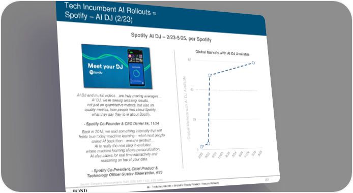 201 Tech Incumbent AI Rollouts = Spotify – AI DJ (2/23) Source: Company announcements (2/23, 5/23, 8/23, 11/24, 4,25, 5/25) Spotify AI DJ – 2/23-5/25, per Spotify AI DJ and music videos…are truly moving averages… AI DJ, we’re seeing amazing results, not just on quantitative metrics, but also on quality metrics, how people feel about Spotify, what they say they love about Spotify. - Spotify Co-Founder & CEO Daniel Ek, 11/24 Global Markets with AI DJ Available AI – Tech Incumbents = Broad & Steady Product / Feature Rollouts Global Markets with AI DJ Available 0 20 40 60 Back in 2018, we said something internally that still holds true today: machine learning – what most people called AI back then – was the product… AI is really the next step in evolution, where machine learning allows personalization, AI also allows for real time interactivity and reasoning on top of your data. - Spotify Co-President, Chief Product & Technology Officer Gustav Söderström, 4/25
