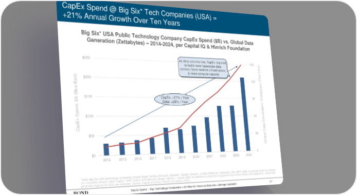 97 CapEx Spend @ Big Six* Tech Companies (USA) = +21% Annual Growth Over Ten Years *Note: Big Six USA technology companies include Apple, Nvidia, Microsoft, Alphabet / Google, Amazon, & Meta Platforms / Facebook. Only AWS CapEx & revenue shown for Amazon (i.e. excludes Amazon retail CapEx). AWS CapEx estimated per Morgan Stanley – equals AWS net additions to property & equipment less finance leases and obligations. Global data generation figures for 2024 are estimates. Source: Capital IQ (3/25), Hinrich Foundation (3/25) Global Data Generation, Zettabytes (Red Line) 0 30 60 90 120 150 $0 $50 $100 $150 $200 $250 2014 2015 2016 2017 2018 2019 2020 2021 2022 2023 2024 CapEx Spend, $B (Blue Bars) As data volumes rise, CapEx required to build more hyperscale data centers, faster network infrastructure, & more compute capacity CapEx: +21% / Year Data: +28% / Year CapEx Spend – Big Technology Companies = On Rise for Years as Data Use + Storage Exploded Big Six* USA Public Technology Company CapEx Spend ($B) vs. Global Data Generation (Zettabytes) – 2014-2024, per Capital IQ & Hinrich Foundation