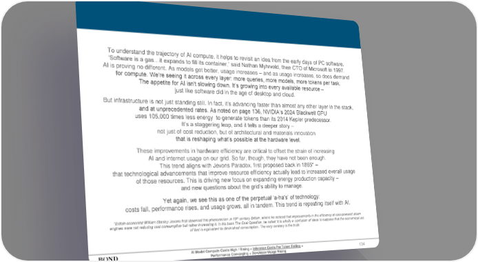 134 To understand the trajectory of AI compute, it helps to revisit an idea from the early days of PC software. ‘Software is a gas…it expands to fill its container,’ said Nathan Myhrvold, then CTO of Microsoft in 1997. AI is proving no different. As models get better, usage increases – and as usage increases, so does demand for compute. We’re seeing it across every layer: more queries, more models, more tokens per task. The appetite for AI isn't slowing down. It’s growing into every available resource – just like software did in the age of desktop and cloud. But infrastructure is not just standing still. In fact, it's advancing faster than almost any other layer in the stack, and at unprecedented rates. As noted on page 136, NVIDIA’s 2024 Blackwell GPU uses 105,000 times less energy to generate tokens than its 2014 Kepler predecessor. It’s a staggering leap, and it tells a deeper story – not just of cost reduction, but of architectural and materials innovation that is reshaping what’s possible at the hardware level. These improvements in hardware efficiency are critical to offset the strain of increasing AI and internet usage on our grid. So far, though, they have not been enough. This trend aligns with Jevons Paradox, first proposed back in 1865* – that technological advancements that improve resource efficiency actually lead to increased overall usage of those resources. This is driving new focus on expanding energy production capacity – and new questions about the grid’s ability to manage. Yet again, we see this as one of the perpetual ‘a-ha’s’ of technology: costs fall, performance rises, and usage grows, all in tandem. This trend is repeating itself with AI. *British economist William Stanley Jevons first observed this phenomenon in 19th-century Britain, where he noticed that improvements in the efficiency of coal-powered steam engines were not reducing coal consumption but rather increasing it. In his book The Coal Question, he noted ‘It is wholly a confusion of ideas to suppose that the economical use of fuel is equivalent to diminished consumption. The very contrary is the truth.’ AI Model Compute Costs High / Rising + Inference Costs Per Token Falling = Performance Converging + Developer Usage Rising