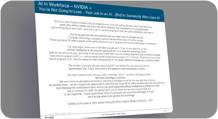 336 AI In Workforce – NVIDIA = You’re Not Going to Lose…Your Job to an AI…[But] to Somebody Who Uses AI Source: Milken Institute (5/25) NVIDIA Co-Founder & CEO Jensen Huang @ Milken Institute Global Conference – 5/25 AI & Work Evolution = Real + Rapid All of you have heard a lot about [AI] job displacement. Every job will be affected. Some jobs will be lost, some jobs will be created, but every job will be affected. And immediately it is unquestionable, you're not going to lose a job – your job to an AI, but you're going to lose your job to somebody who uses AI… …But let me give you the two extremes that you might want to consider as well. Computer technology, computer science has benefited about 30 million people. There are about 30 million people in the world who know how to program and use this technology to its extreme… …The other eight, seven and a half billion people don't. I'll put on the table that, in fact, artificial intelligence is the greatest opportunity for us to close the technology divide. And let me prove it to you. You know, if we just look in this room, it's very unlikely that more than a handful of people know how to program with C++, and an equal number know how to program in C. And yet, 100 percent of you know how to program in AI. And the reason for that is because the AI will speak whatever language you wanted to speak… …The number of people who are using ChatGPT and Gemini Pro and these AIs kind of demonstrate that, in fact, this is one of the easiest to use technologies in history… …The other extreme that I will say is that, remember, we’re – we have a shortage of labor. We have a shortage of workers. We don't have an abundance of workers. We have a shortage of and for the very first time in history, we actually have – we can imagine the opportunity to close that gap to put 30-40 million workers back into the workforce that otherwise the world doesn't have. And so you could argue that artificial intelligence is probably our best way to increase the GDP, the global GDP, and so those are two other ways to look at it. In the meantime, I would recommend 100% of everybody you know take advantage of AI and don't be that person who ignores this technology.