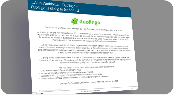 327 …AI In Workforce – Duolingo = Duolingo Is Going to be AI-First Source: Duolingo via LinkedIn (4/25) AI & Work Evolution = Real + Rapid I’ve said this in Q&As and many meetings, but I want to make it official: Duolingo is going to be AI-first. AI is already changing how work gets done. It’s not a question of if or when. It’s happening now. When there’s a shift this big, the worst thing you can do is wait. In 2012, we bet on mobile. While others were focused on mobile companion apps for websites, we decided to build mobile-first because we saw it was the future. That decision helped us win the 2013 iPhone App of the Year and unlocked the organic word-of-mouth growth that followed… …AI isn’t just a productivity boost. It helps us get closer to our mission. To teach well, we need to create a massive amount of content, and doing that manually doesn’t scale. One of the best decisions we made recently was replacing a slow, manual content creation process with one powered by AI. Without AI, it would take us decades to scale our content to more learners. We owe it to our learners to get them this content ASAP… …Being AI-first means we will need to rethink much of how we work. Making minor tweaks to systems designed for humans won’t get us there…We can’t wait until the technology is 100% perfect. We’d rather move with urgency and take occasional small hits on quality than move slowly and miss the moment. We’ll be rolling out a few constructive constraints to help guide this shift…: • …AI use will be part of what we look for in hiring • AI use will be part of what we evaluate in performance reviews • Headcount will only be given if a team cannot automate more of their work • Most functions will have specific initiatives to fundamentally change how they work… Duolingo Co-Founder & CEO Luis von Ahn in All-Hands Memo on AI – 4/25