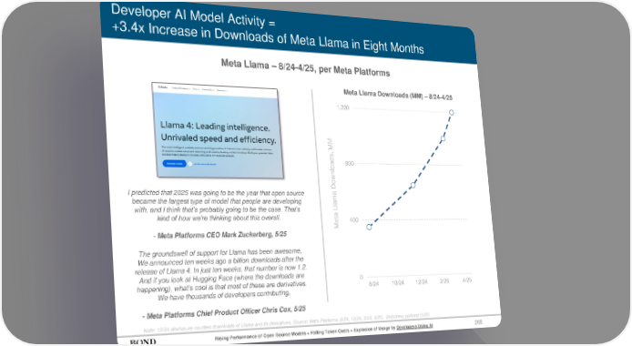 268 Developer AI Model Activity = +3.4x Increase in Downloads of Meta Llama in Eight Months Note: 12/24 disclosure counted downloads of Llama and its derivatives. Source: Meta Platforms (8/24, 12/24, 3/25, 4/25), Stratchery podcast (5/25) Meta Llama – 8/24-4/25, per Meta Platforms Rising Performance of Open-Source Models + Falling Token Costs = Explosion of Usage by Developers Using AI I predicted that 2025 was going to be the year that open source became the largest type of model that people are developing with, and I think that’s probably going to be the case. That’s kind of how we’re thinking about this overall. - Meta Platforms CEO Mark Zuckerberg, 5/25 Meta Llama Downloads, MM Meta Llama Downloads (MM) – 8/24-4/25 0 400 800 1,200 8/24 10/24 12/24 2/25 4/25 The groundswell of support for Llama has been awesome. We announced ten weeks ago a billion downloads after the release of Llama 4. In just ten weeks, that number is now 1.2. And if you look at Hugging Face (where the downloads are happening), what’s cool is that most of these are derivatives. We have thousands of developers contributing. - Meta Platforms Chief Product Officer Chris Cox, 5/25