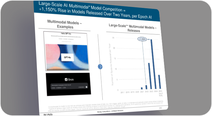 252 Large-Scale AI Multimodal* Model Competition = +1,150% Rise in Models Released Over Two Years, per Epoch AI *A multimodal AI model is one that can process and integrate multiple types of data, e.g., text, images, audio, or video, to understand and generate outputs across different modalities. **Epoch AI defines large-scale as models where their training compute is confirmed to exceed 1023 floating-point operations. An AI system can operate in more than one domain and may be double-counted across pages. Source: Epoch AI via Our World in Data (4/25), OpenAI, DeepSeek, Google Multimodal Models – Examples Large-Scale** Multimodal Models – Releases Number of Systems Released per Year 0 5 10 15 20 25 2017 2018 2019 2020 2021 2022 2023 2024 2025 (as of 5/25) +1,150% Rising Competition = AI Model Releases