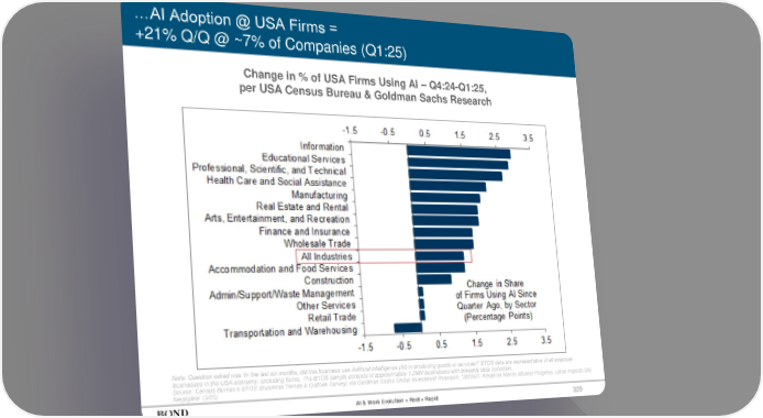 …AI Adoption @ USA Firms = +21% Q/Q @ ~7% of Companies (Q1:25) 329 Change in % of USA Firms Using AI – Q4:24-Q1:25, per USA Census Bureau & Goldman Sachs Research Note: Question asked was ‘In the last six months, did this business use Artificial Intelligence (AI) in producing goods or services?’ BTOS data are representative of all employer businesses in the USA economy, excluding farms. The BTOS sample consists of approximately 1.2MM businesses with biweekly data collection. Source: Census Bureau’s BTOS (Business Trends & Outlook Survey) via Goldman Sachs Global Investment Research, ‘2025Q1: Adoption Makes Modest Progress, Labor Impacts Still Negligible’ (3/25) AI & Work Evolution = Real + Rapid