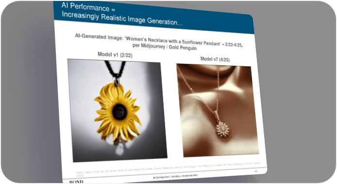 44 AI Performance = Increasingly Realistic Image Generation… Notes: Dates shown are the release dates of each Midjourney model. Source: Midjourney (4/25) & Gold Penguin, ‘How Midjourney Evolved Over Time (Comparing V1 to V6.1 Outputs)’ (9/24) AI-Generated Image: ‘Women’s Necklace with a Sunflower Pendant’ – 2/22-4/25, per Midjourney / Gold Penguin Model v1 (2/22) Model v7 (4/25) AI Development Trending = Unprecedented