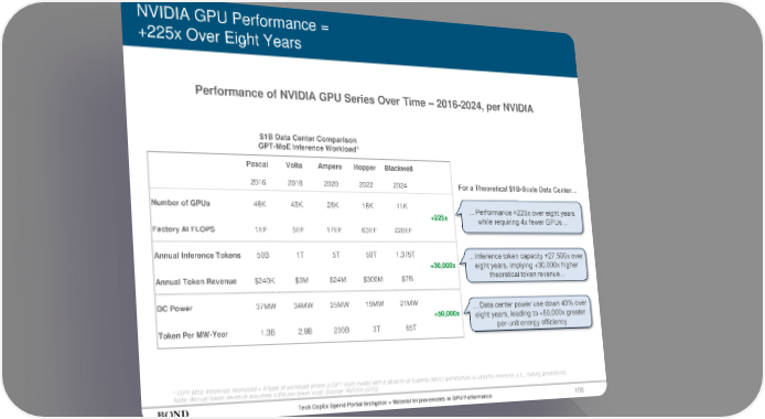 NVIDIA GPU Performance = +225x Over Eight Years 106 1 GPT-MoE Inference Workload = A type of workload where a GPT-style model with a Mixture-of-Experts (MoE) architecture is used for inference (i.e., making predictions). Note: Annual token revenue assumes a flat per-token cost. Source: NVIDIA (5/25) Performance of NVIDIA GPU Series Over Time – 2016-2024, per NVIDIA Tech CapEx Spend Partial Instigator = Material Improvements in GPU Performance Pascal Volta Ampere Hopper Blackwell 2016 2018 2020 2022 2024 Number of GPUs 46K 43K 28K 16K 11K +225x Factory AI FLOPS 1EF 5EF 17EF 63EF 220EF Annual Inference Tokens 50B 1T 5T 58T 1,375T +30,000x Annual Token Revenue $240K $3M $24M $300M $7B DC Power 37MW 34MW 25MW 19MW 21MW +50,000x Token Per MW-Year 1.3B 2.9B 200B 3T 65T …Performance +225x over eight years while requiring 4x fewer GPUs… $1B Data Center Comparison GPT-MoE Inference Workload1 …Inference token capacity +27,500x over eight years, implying +30,000x higher theoretical token revenue… …Data center power use down 43% over eight years, leading to +50,000x greater per-unit energy efficiency For a Theoretical $1B-Scale Data Center…