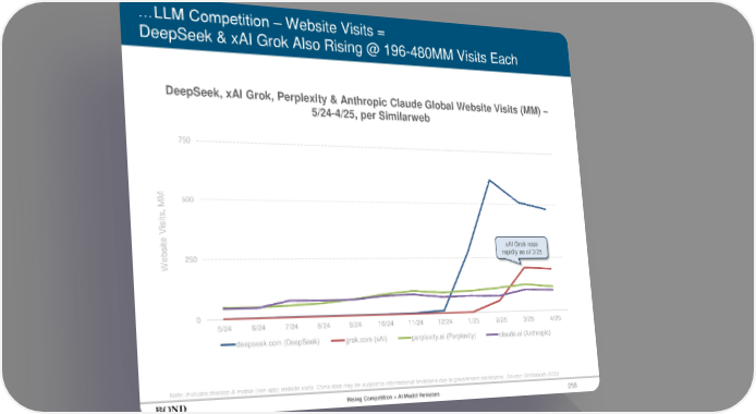 258 …LLM Competition – Website Visits = DeepSeek & xAI Grok Also Rising @ 196-480MM Visits Each DeepSeek, xAI Grok, Perplexity & Anthropic Claude Global Website Visits (MM) – 5/24-4/25, per Similarweb Note: Includes desktop & mobile (non-app) website visits. China data may be subject to informational limitations due to government restrictions. Source: Similarweb (5/25) 0 250 500 750 5/24 6/24 7/24 8/24 9/24 10/24 11/24 12/24 1/25 2/25 3/25 4/25 deepseek.com (DeepSeek) grok.com (xAI) perplexity.ai (Perplexity) claude.ai (Anthropic) Website Visits, MM xAI Grok rose rapidly as of 3/25 Rising Competition = AI Model Releases