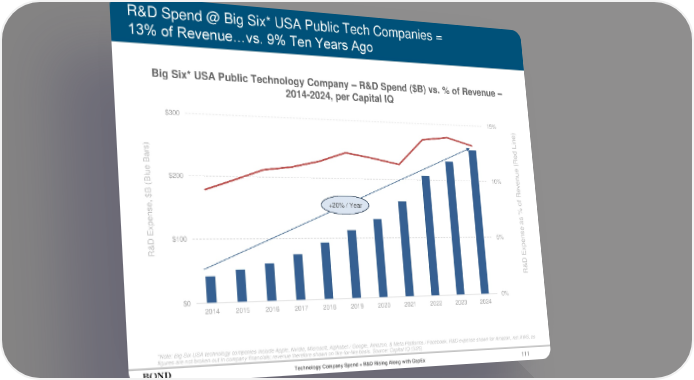 111 R&D Spend @ Big Six* USA Public Tech Companies = 13% of Revenue…vs. 9% Ten Years Ago *Note: Big Six USA technology companies include Apple, Nvidia, Microsoft, Alphabet / Google, Amazon, & Meta Platforms / Facebook. R&D expense shown for Amazon, not AWS, as figures are not broken out in company financials; revenue therefore shown on like-for-like basis. Source: Capital IQ (3/25) R&D Expense, $B (Blue Bars) R&D Expense as % of Revenue (Red Line) 0% 5% 10% 15% $0 $100 $200 $300 2014 2015 2016 2017 2018 2019 2020 2021 2022 2023 2024 +20% / Year Technology Company Spend = R&D Rising Along with CapEx Big Six* USA Public Technology Company – R&D Spend ($B) vs. % of Revenue – 2014-2024, per Capital IQ