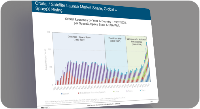 Cold War / Space Race (1957-1991) Post-Cold War (1992-2007) Commercial + National Renaissance (2008-2024) Orbital / Satellite Launch Market Share, Global = SpaceX Rising 319 New Internet User Growth = Enabled by AI + Satellites Orbital Launches by Year & Country – 1957-2025, per SpaceX, Space Stats & USA FAA Note: Orbital launches from other celestial bodies than Earth are not included (e.g., Apollo LM ascents from the Moon’s surface). Source: SpaceX public announcements (1/25), Space Stats (3/25), USA Federal Aviation Administration (3/25) 0 100 200 300 SpaceX United States (Excluding SpaceX) China Russia Others Launches per Year