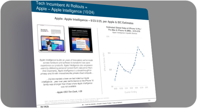 Tech Incumbent AI Rollouts = Apple – Apple Intelligence (10/24) Note: Counts sales of iPhone 15 Pro, iPhone 15 Pro Max, & iPhone 16 devices. Figures are estimates. Source: Company announcements & investor filings; IDC via Morgan Stanley (4/25) Apple: Apple Intelligence – 9/23-3/25, per Apple & IDC Estimates Apple Intelligence builds on years of innovations we've made across hardware and software to transform how users experience our products. Apple Intelligence also empowers users by delivering personal context that's relevant to them. And importantly, Apple Intelligence is a breakthrough for privacy and AI with innovations like private cloud compute… …[in] the markets where we had rolled out Apple Intelligence…year over year performance on the iPhone 16 family was stronger than those where Apple Intelligence was not available. - Apple CEO Tim Cook, 1/25 iPhone Sales, MM Estimated Global Sales of iPhone 15 Pro / Pro Max & iPhone 16 (MM) – 9/23-3/25 Apple Intelligence-Capable Devices $0 $25 $50 $75 9/23 12/23 3/24 6/24 9/24 12/24 3/25 Quarter Ending 208 AI – Tech Incumbents = Broad & Steady Product / Feature Rollouts