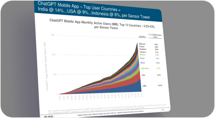 316 ChatGPT Mobile App – Top User Countries = India @ 14%...USA @ 9%...Indonesia @ 6%, per Sensor Tower Global Internet User Ramps Powered by AI from Get-Go = Growth We Have Not Seen Likes of Before ChatGPT Mobile App Monthly Active Users (MM), Top 10 Countries – 5/23-4/25, per Sensor Tower Note: Regions are per United Nations definitions. ChatGPT app not available in China, Russia and select other countries as of 5/25. Includes only Android, iPhone & iPad users. Figures may understate true ChatGPT user base (e.g., desktop or mobile webpage users). Data for standalone app only. Source: Sensor Tower (5/6/25) ChatGPT App Monthly Active Users, MM 0 100 200 300 5/23 6/23 7/23 8/23 9/23 10/23 11/23 12/23 1/24 2/24 3/24 4/24 5/24 6/24 7/24 8/24 9/24 10/24 11/24 12/24 1/25 2/25 3/25 4/25 India Pakistan Mexico Egypt Brazil Indonesia USA Country % of Global Users (4/25) 13.5% 3.0% 3.5% 3.9% 5.4% 5.7% 8.9% Germany 3.0% France Vietnam 2.9% 2.6%