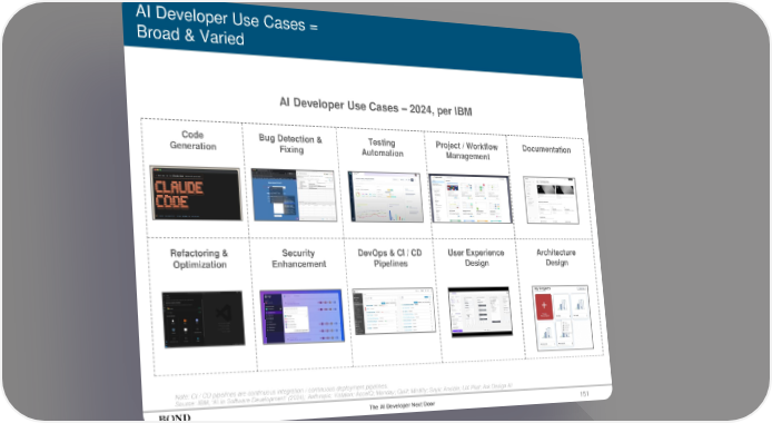 151 AI Developer Use Cases = Broad & Varied Note: CI / CD pipelines are continuous integration / continuous deployment pipelines. Source: IBM, ‘AI in Software Development’ (2024); Anthropic; Katalon; AccelQ; Monday; Quill; Mintlify; Snyk; Ansible; UX Pilot; Ark Design AI AI Developer Use Cases – 2024, per IBM Code Generation Bug Detection & Fixing Testing Automation Project / Workflow Management Documentation Refactoring & Optimization Security Enhancement DevOps & CI / CD Pipelines User Experience Design Architecture Design The AI Developer Next Door
