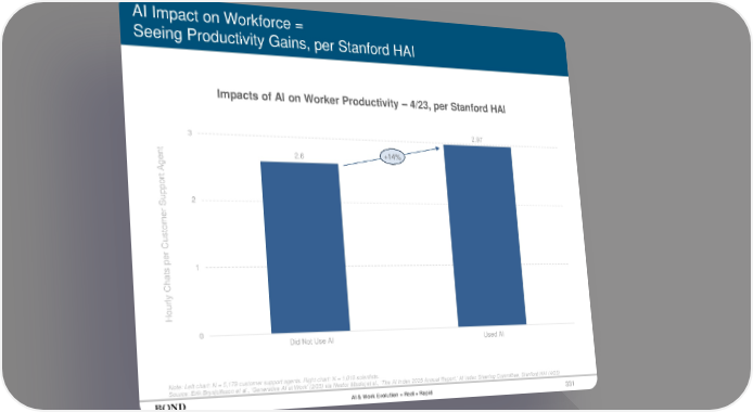 331 AI Impact on Workforce = Seeing Productivity Gains, per Stanford HAI Note: Left chart: N = 5,179 customer support agents. Right chart: N = 1,018 scientists. Source: Erik Brynjolfsson et al., ‘Generative AI at Work’ (2/25) via Nestor Maslej et al., ‘The AI Index 2025 Annual Report,’ AI Index Steering Committee, Stanford HAI (4/25) Impacts of AI on Worker Productivity – 4/23, per Stanford HAI AI & Work Evolution = Real + Rapid 2.6 2.97 0 1 2 3 Did Not Use AI Used AI Hourly Chats per Customer Support Agent +14%