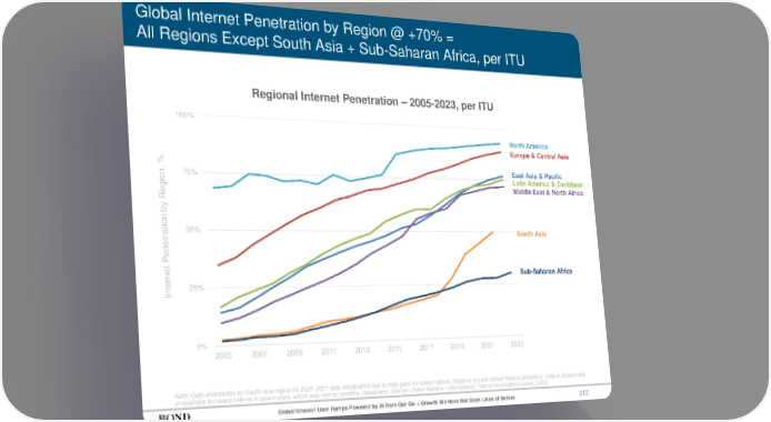 312 Global Internet Penetration by Region @ +70% = All Regions Except South Asia + Sub-Saharan Africa, per ITU Note: Data unavailable for South Asia region for 2023. 2021 data interpolated due to data gaps for select nations. Regions are per United Nations definitions. Data is occasionally unavailable for select nations in select years, which may lead to trendline choppiness. Source: United Nations / International Telecommunications Union (3/25) Regional Internet Penetration – 2005-2023, per ITU Global Internet User Ramps Powered by AI from Get-Go = Growth We Have Not Seen Likes of Before Internet Penetration by Region, % 0% 25% 50% 75% 100% 2005 2007 2009 2011 2013 2015 2017 2019 2021 2023 North America Europe & Central Asia East Asia & Pacific Latin America & Caribbean Middle East & North Africa South Asia Sub-Saharan Africa