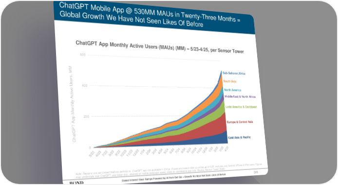 315 ChatGPT Mobile App @ 530MM MAUs in Twenty-Three Months = Global Growth We Have Not Seen Likes Of Before Global Internet User Ramps Powered by AI from Get-Go = Growth We Have Not Seen Likes of Before ChatGPT App Monthly Active Users (MAUs) (MM) – 5/23-4/25, per Sensor Tower 0 200 400 600 ChatGPT App Monthly Active Users, MM East Asia & Pacific Sub-Saharan Africa South Asia North America Middle East & North Africa Latin America & Caribbean Europe & Central Asia Note: Regions are per United Nations definitions. ChatGPT app not available in China, Russia and select other countries as of 5/25. Includes only Android, iPhone & iPad users. Figures may understate true ChatGPT user base (e.g., desktop or mobile webpage users). Data for standalone app only. Source: Sensor Tower (5/25)